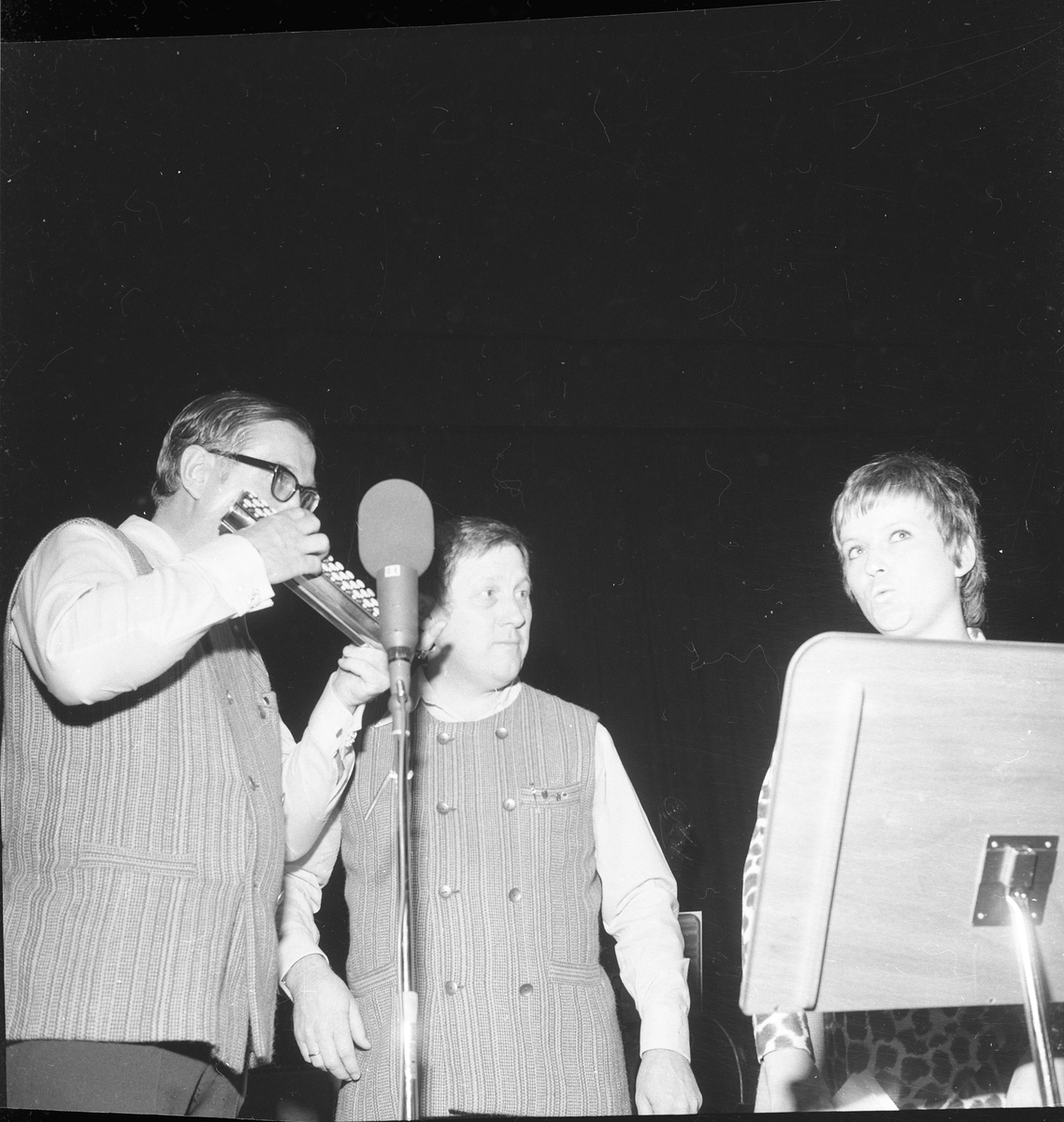 Två män och en kvinna på en scen. Den en mannen spelar på ett blåsinstrument.