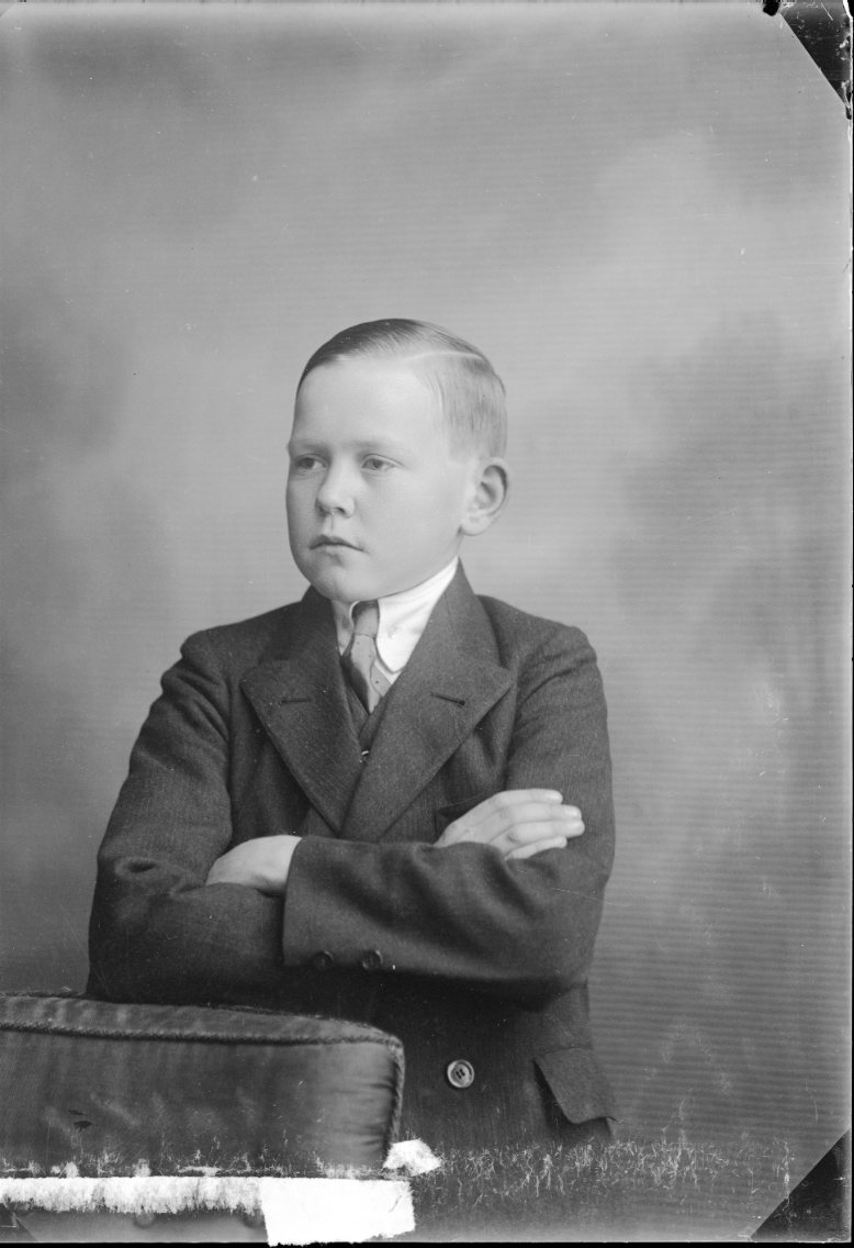 Porträtt av en pojke i kavaj och slips, stående med armarna i kors bakom en stolsrygg.