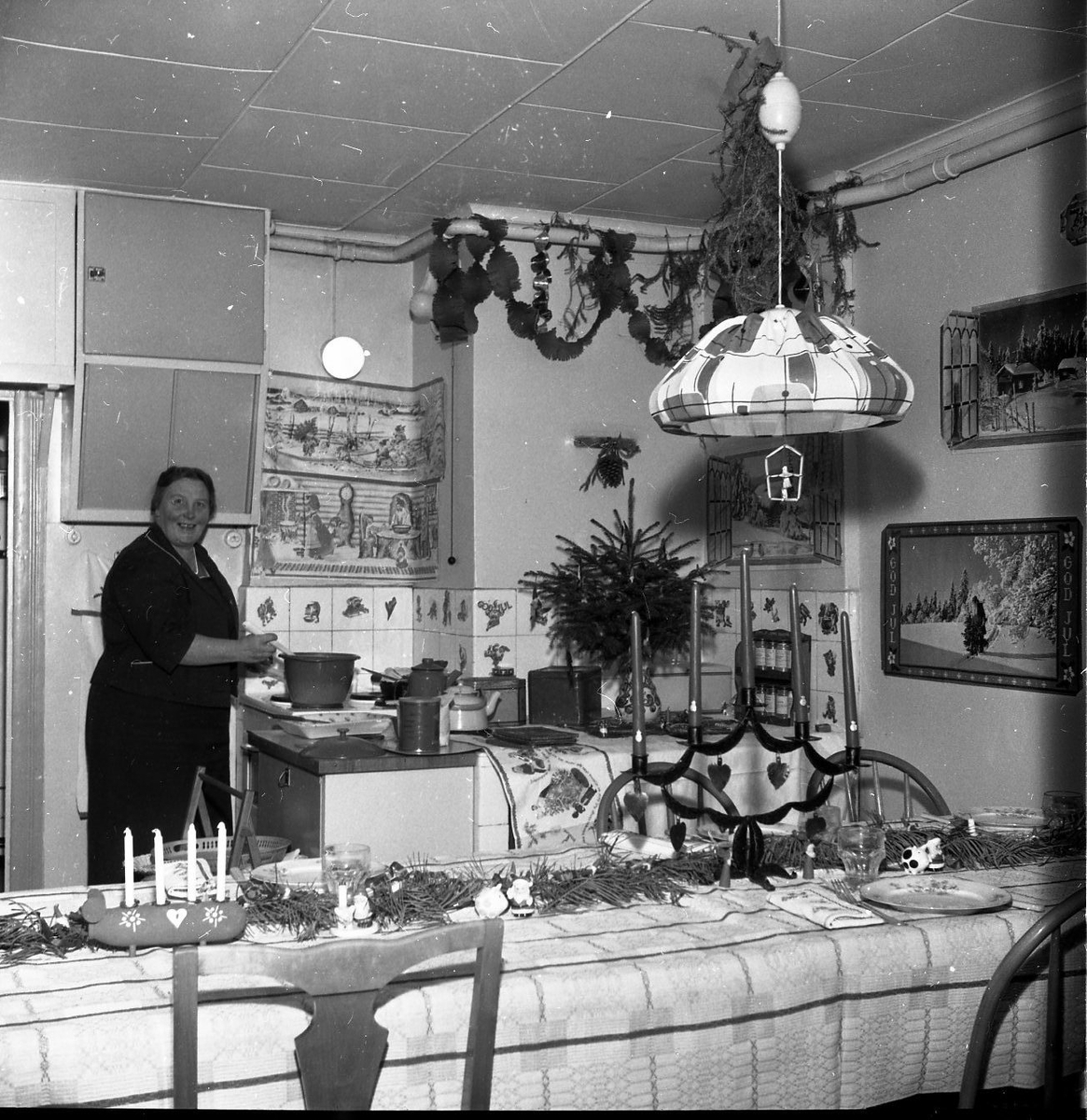En kvinna står vid en spis. Hon ler mot kameran. Mitt i rummet står ett dukat bord. Bordet är dekoretat med julljustakar och ris.