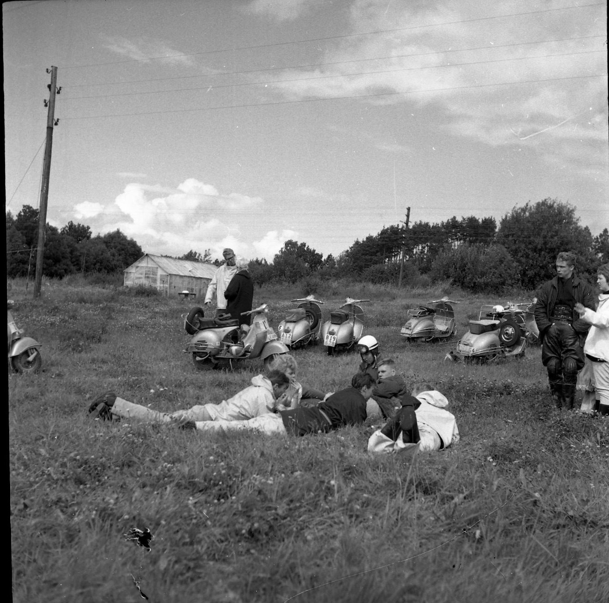 Fem personer ligger utsträckta på en gräsplan. En av dem bär en hjälm. Runt omkring dem står vespor.