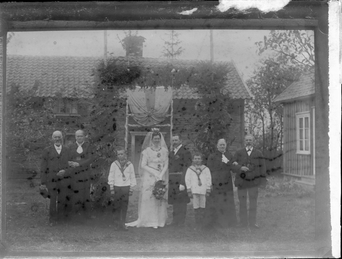 Ett brudpar står framför en byggnad med lövad portal och i kortänden ihopbunden flagga. De flankeras av två pojkar i sjömanskostym samt sannolikt respektives föräldrar. Brudparet är sannolikt Emma Maria Johansson och Viktor Lagerstedt.