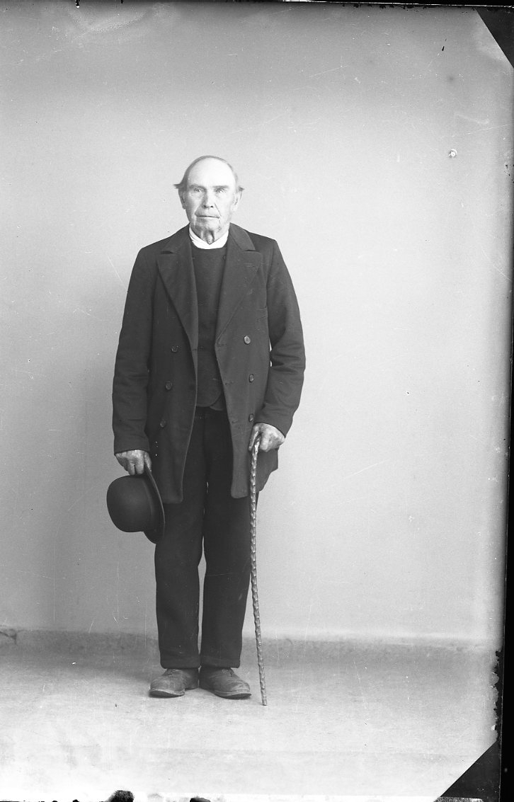 Porträtt av en äldre tunnhårig man med käpp i ena handen och hatten i den andra. Troligen boende i Krösatorpet.