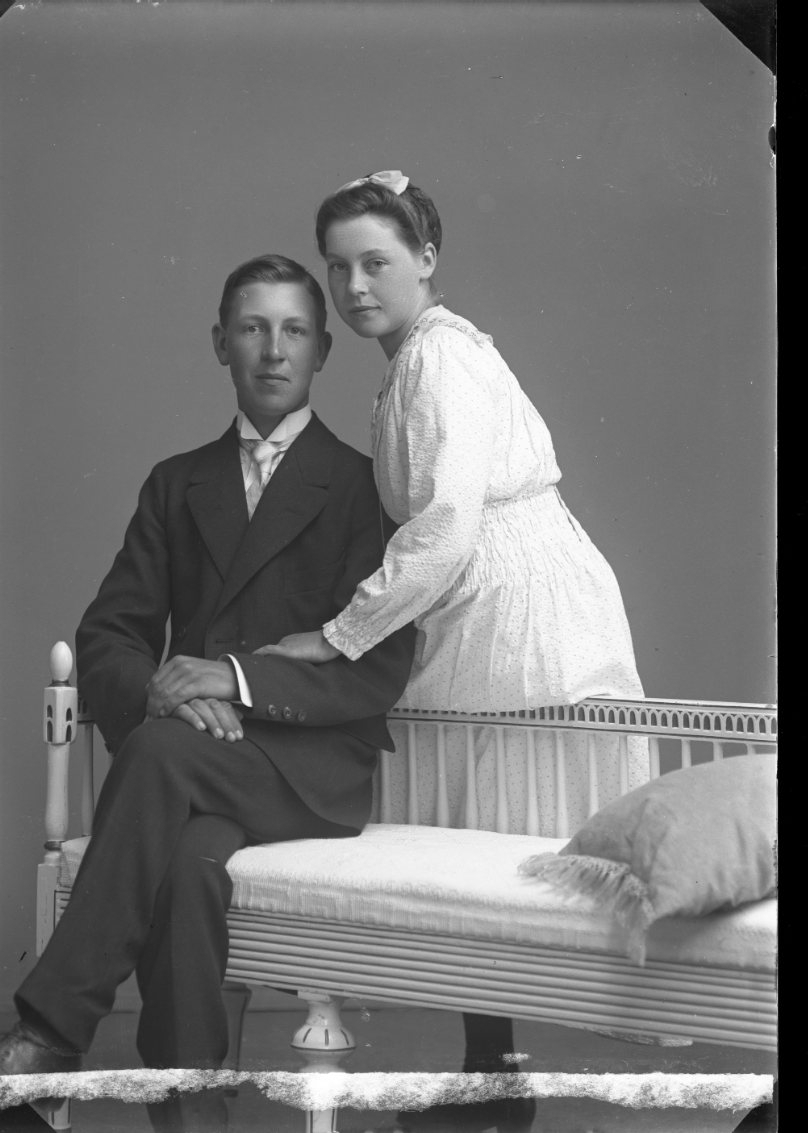 En ung man och en flicka i övre tonåren. Han sitter i en soffa och hon sitter på ryggen bakom honom, vilar sin vänsterhand på hans vänsterarm.