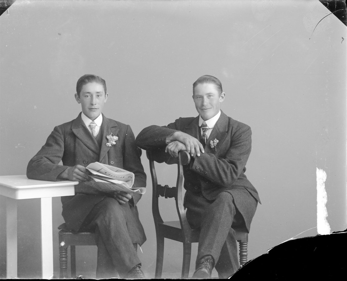 Två unga och glada män sitter vid ett bord, den ena med en tidning i händerna.