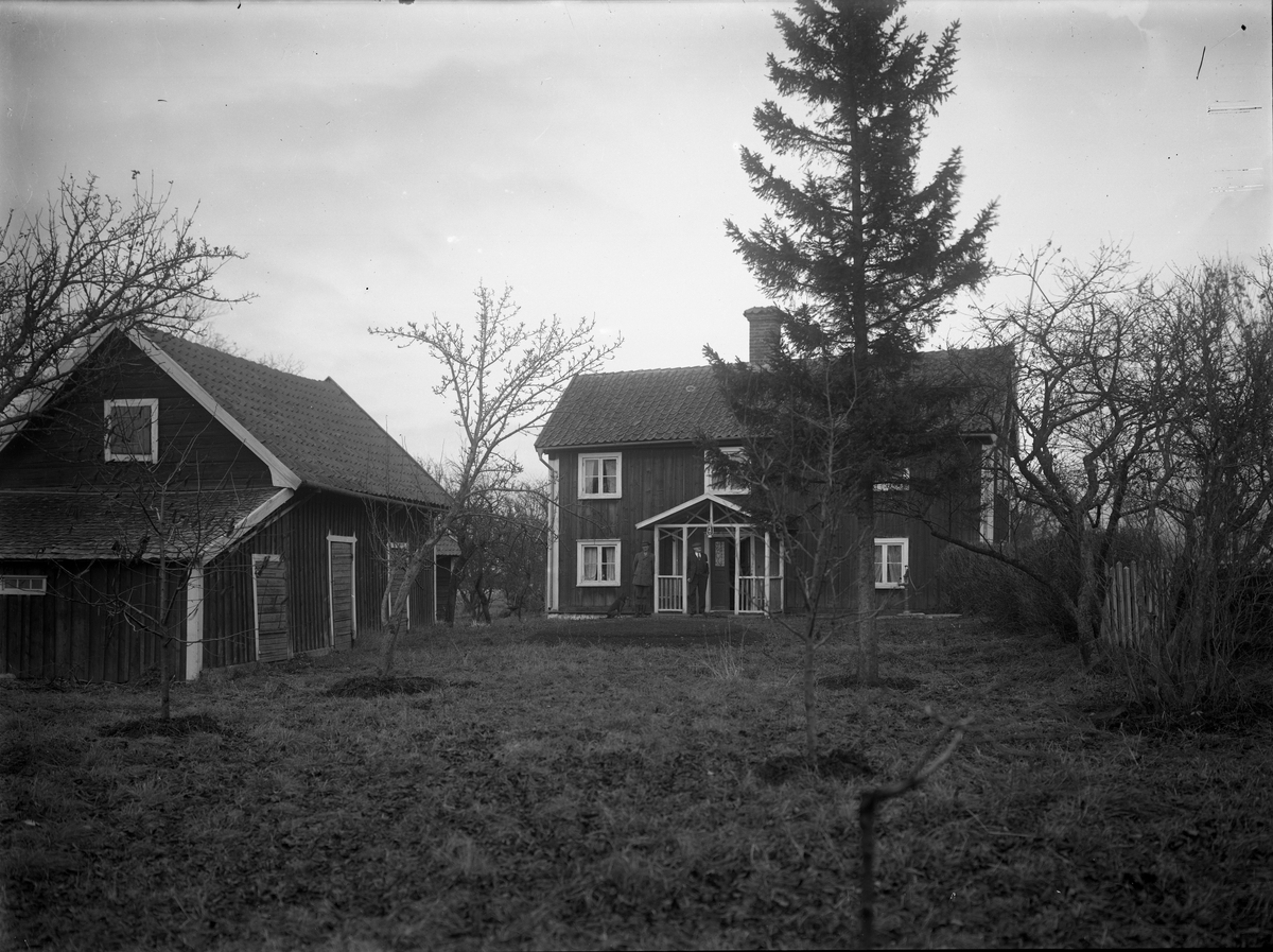 En okänd gård med tvåvåningshus och ekonomibyggand. Två män och en hund står vid farstun.
