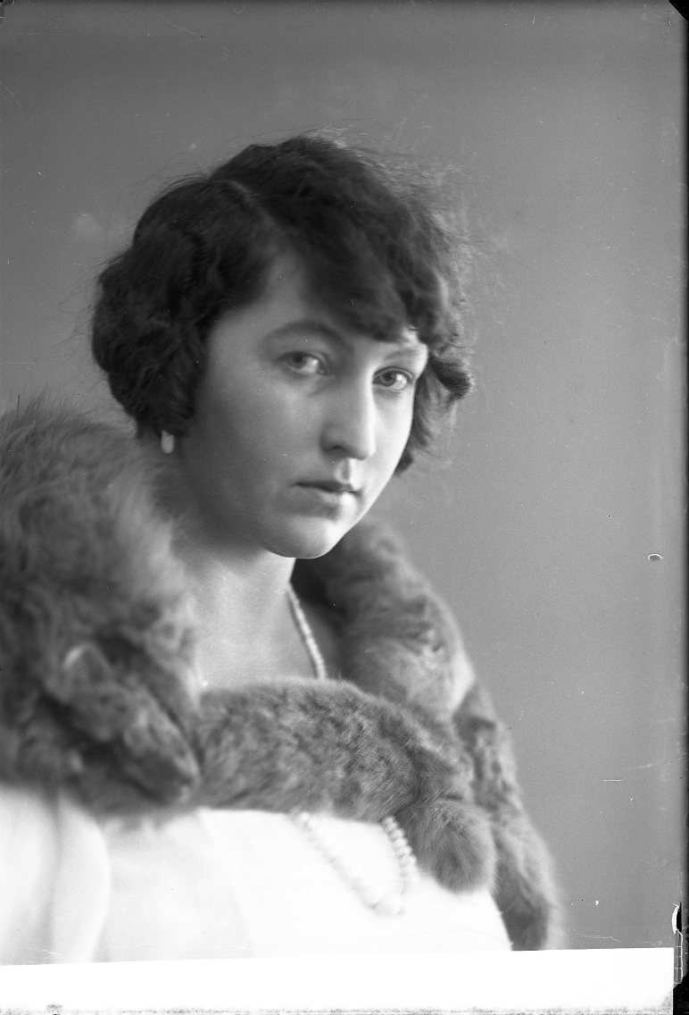 Porträtt av en kvinna med boa runt halsen.