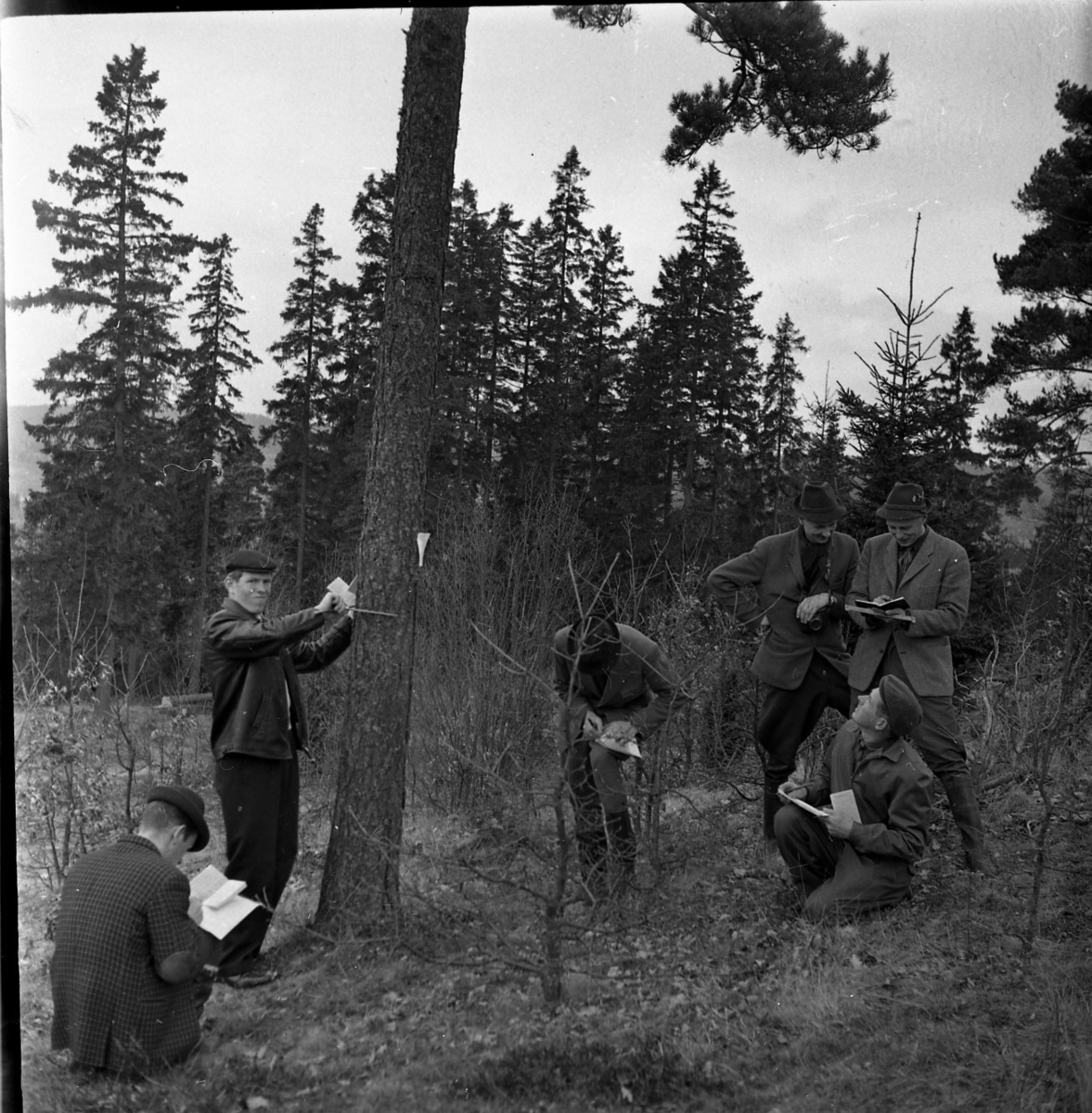 Några män står runt ett träd. Några sitter hukade och några står. Alla skriver på varsitt papper.