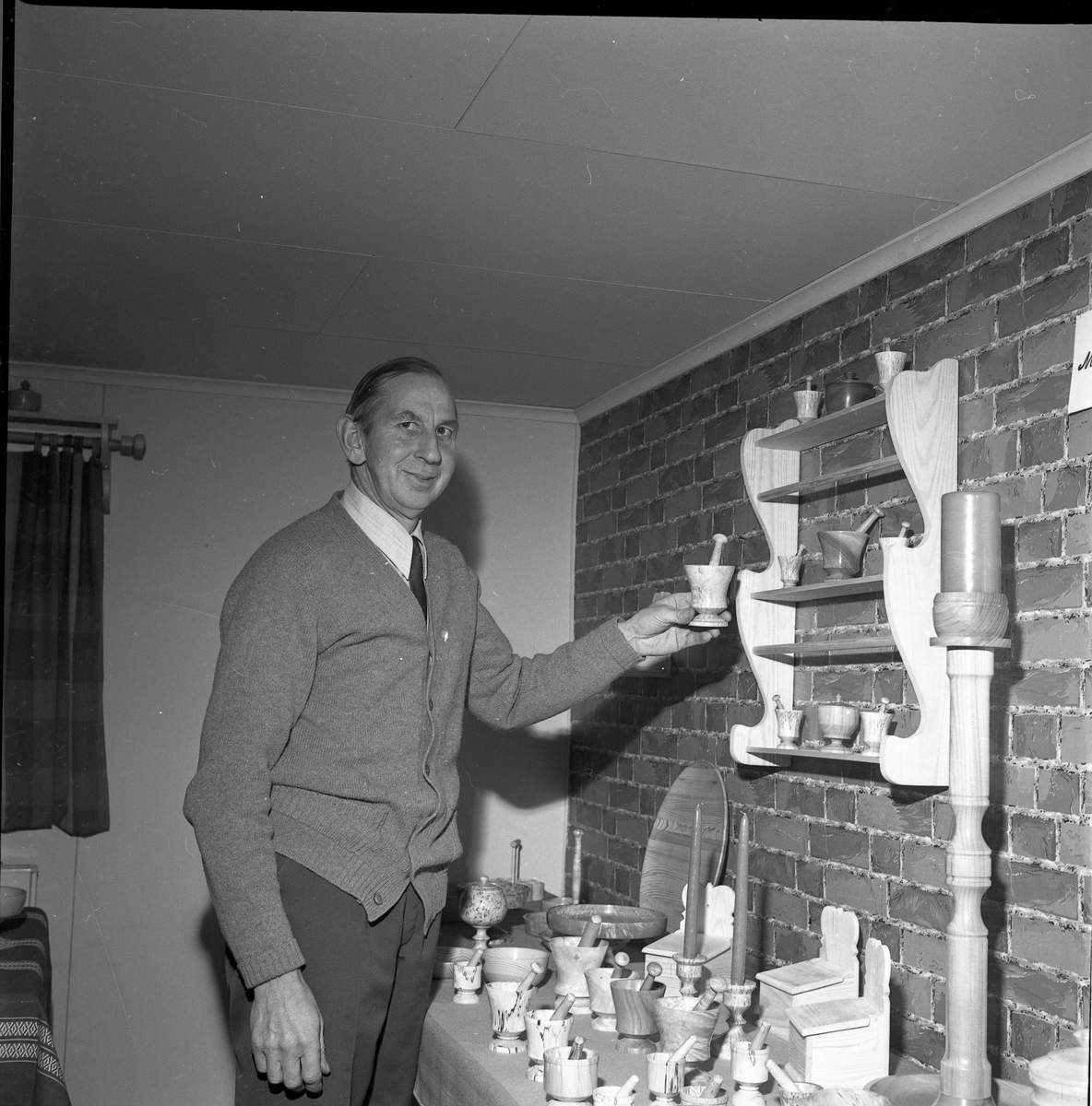 En man i cardigan vid ett bord och vägghylla med svarvade skålar och fat.