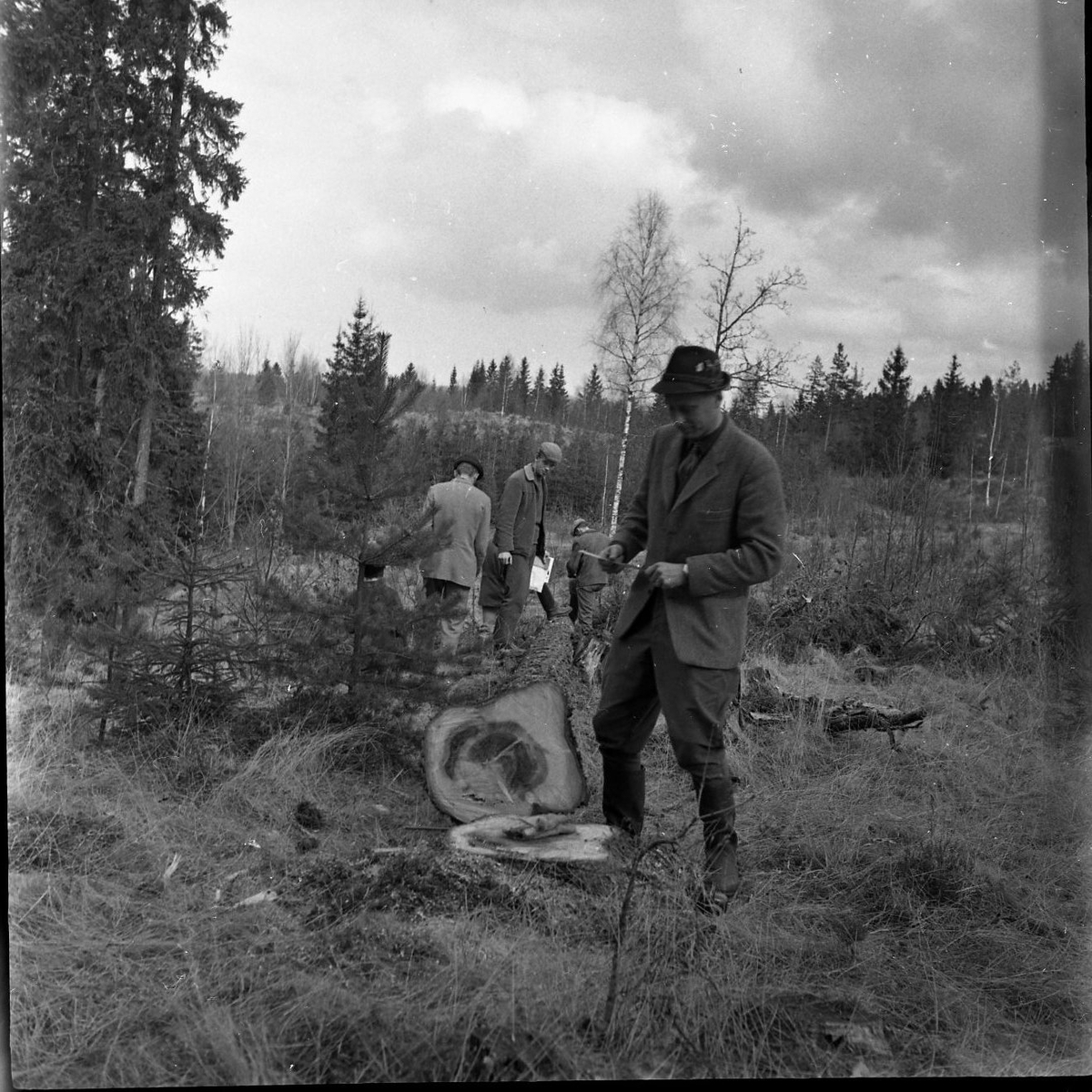 Några män står runt ett fällt träd. De befinner sig i ett kalhygge. En man står med ett verktyg i handen.
