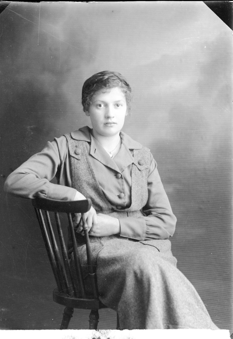 Porträtt av en flicka i övre tonåren som sitter på en pinnstol.