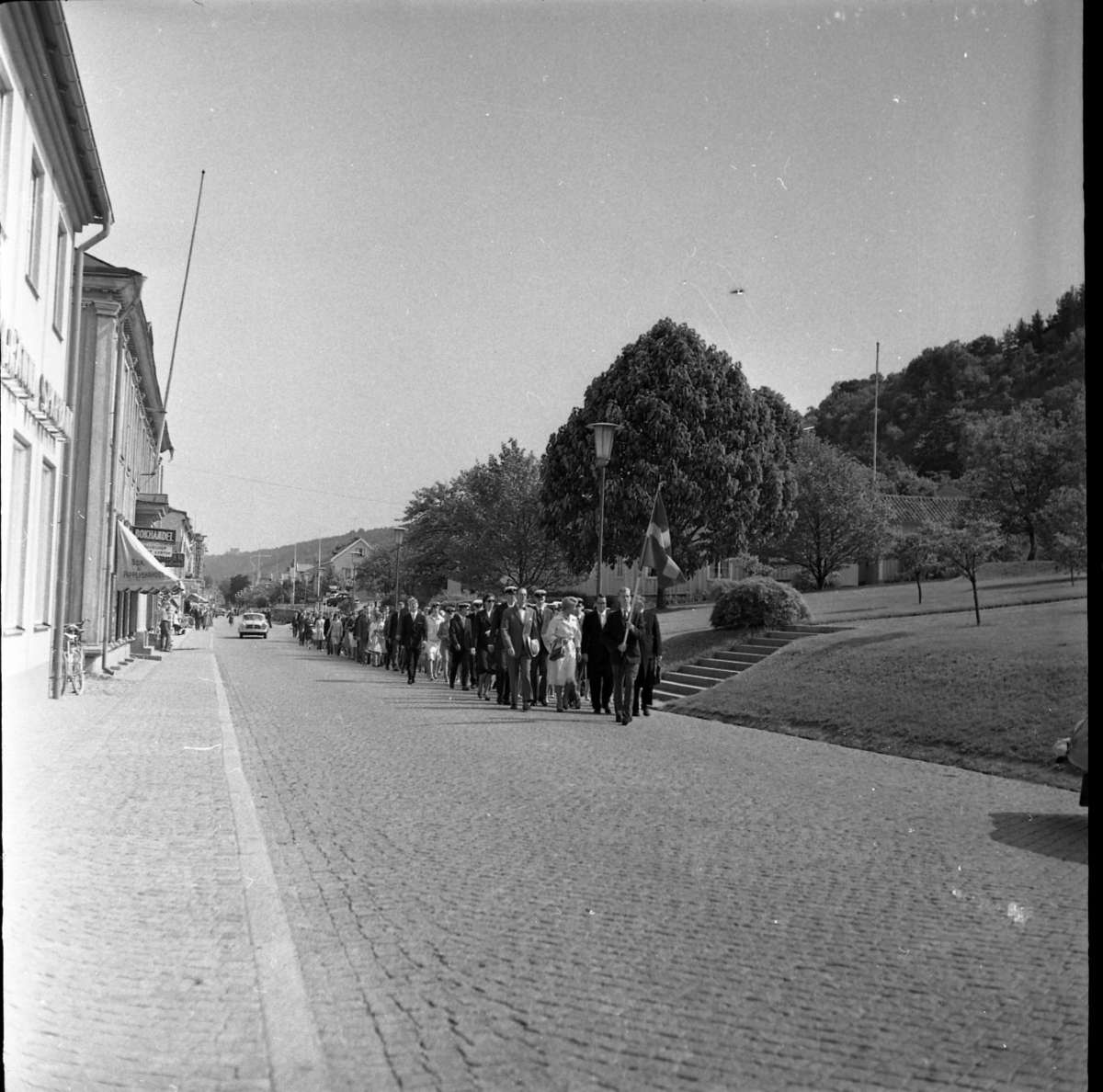 Studenter iklädda realskolemössor promenerar på ett led längst Brahegatan vid Braheparken. Längst fram går en fanbärare med svenska flaggan i händerna. I bakgrunden skymtar Franckska gården.