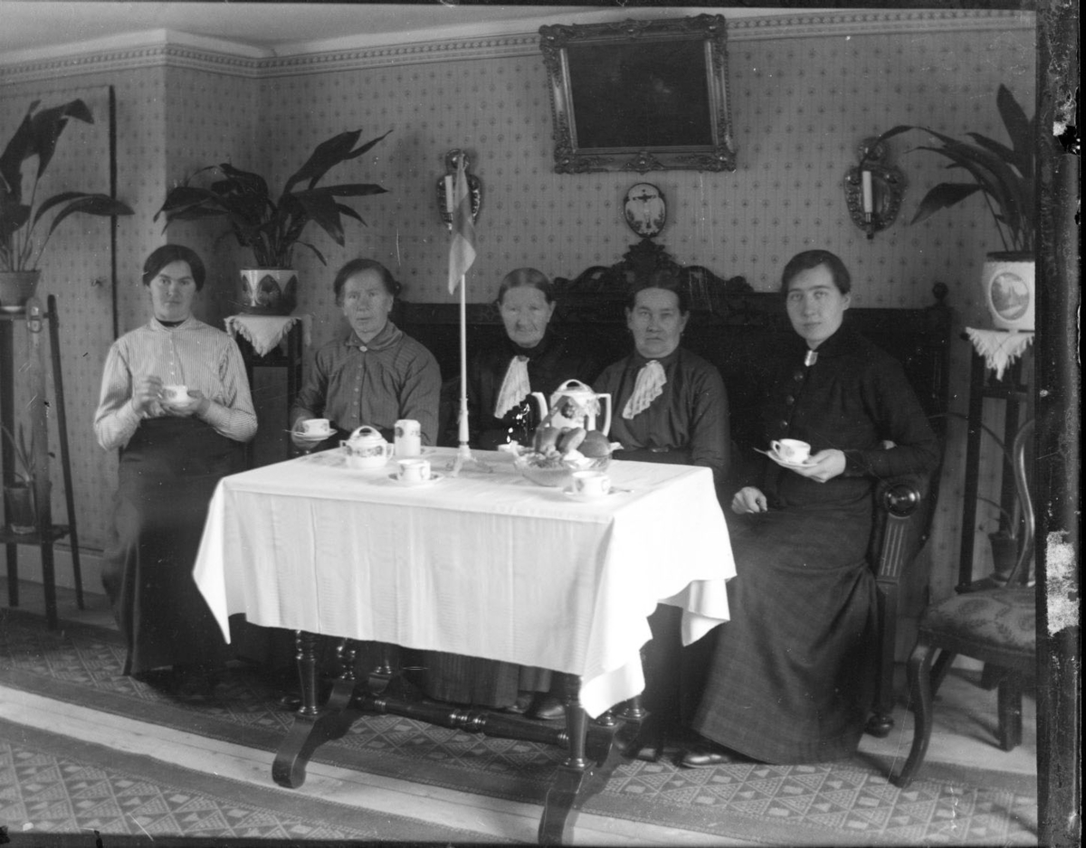 Fem kvinnor sitter i en soffa vid ett kaffebord. Flera av kvinnorna håller en kaffekopp i handen. Svensk bordsflagga på bordet.