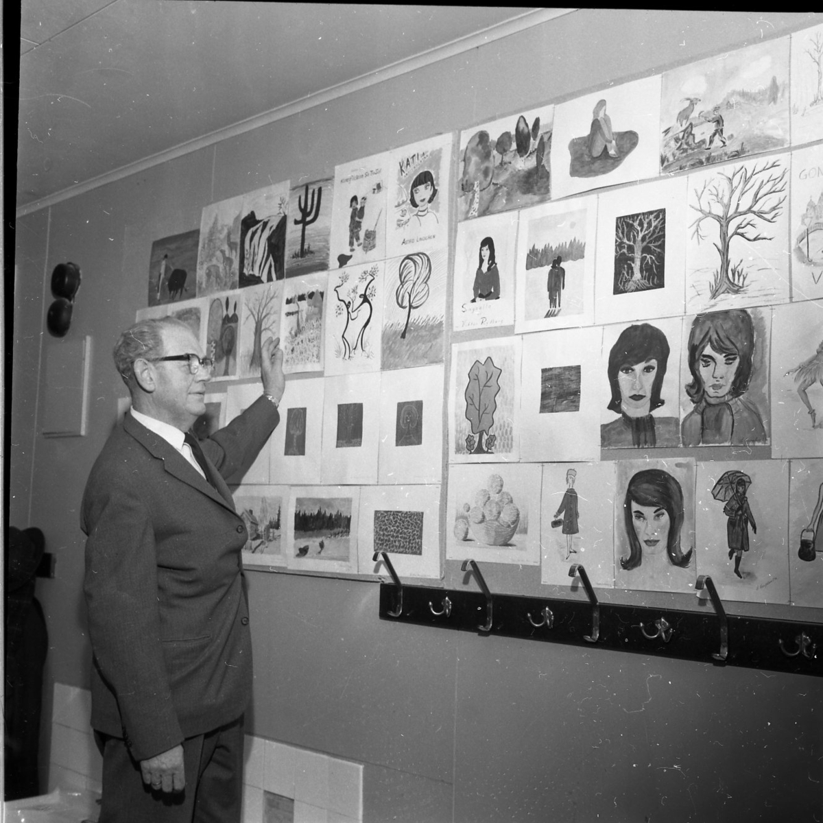 Flera teckningar täcker en vägg. En man står och gestikulerar framför väggen som om han visar och pratar om konsten.