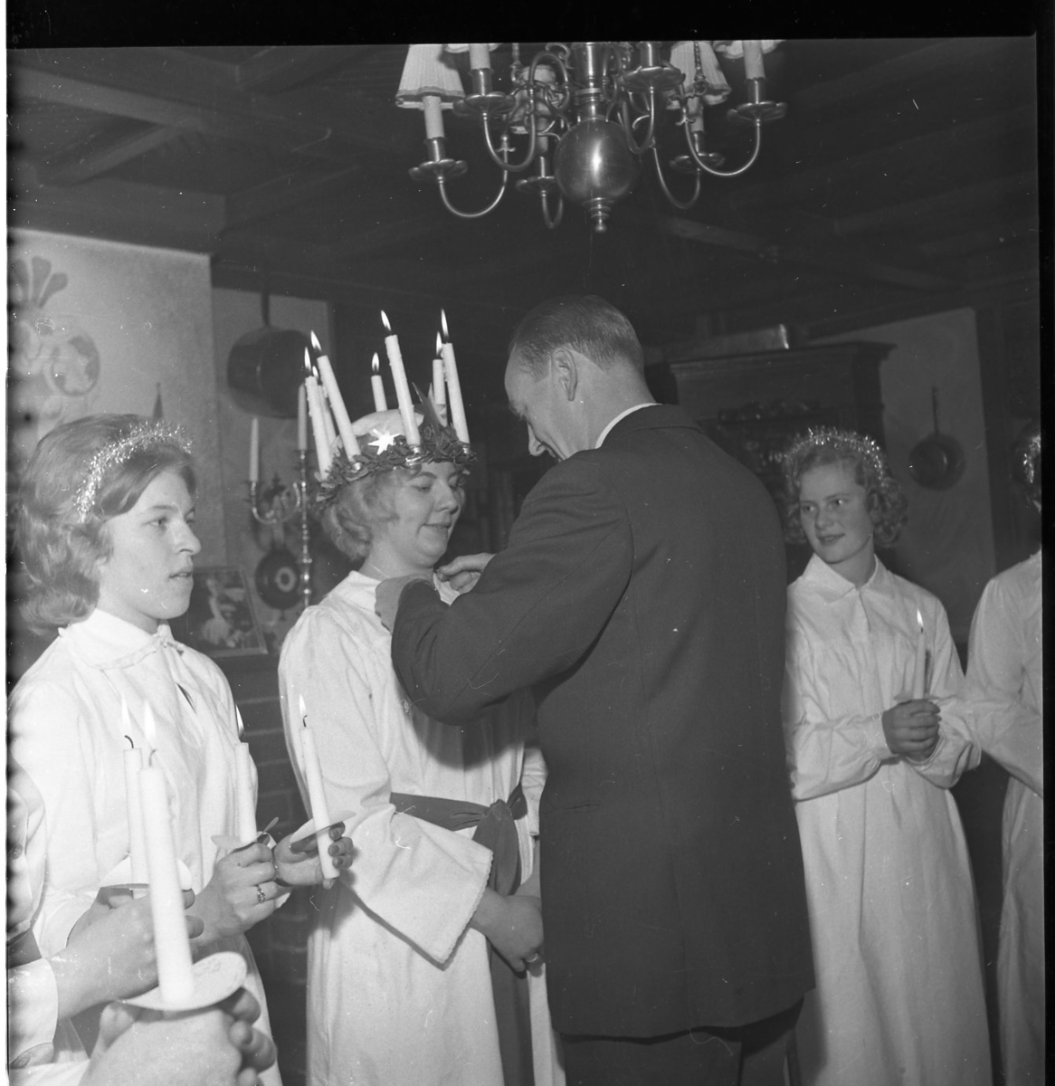 En man hänger ett smycke på Lucia. Tärnorna som flankerar är Gerd Lago och Ing-Britt Björk.
