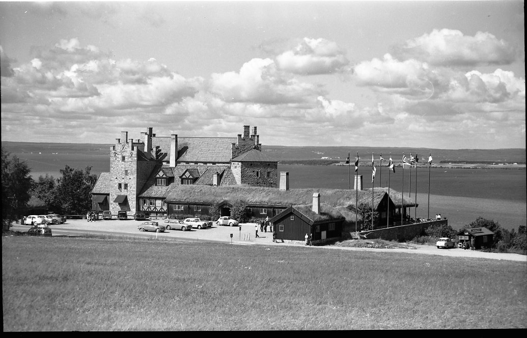 Hotell/restaurang Gyllene Uttern från öster med Vättern i bakgrunden. Bilar på parkeringen. Flera nationsflaggor hissade.