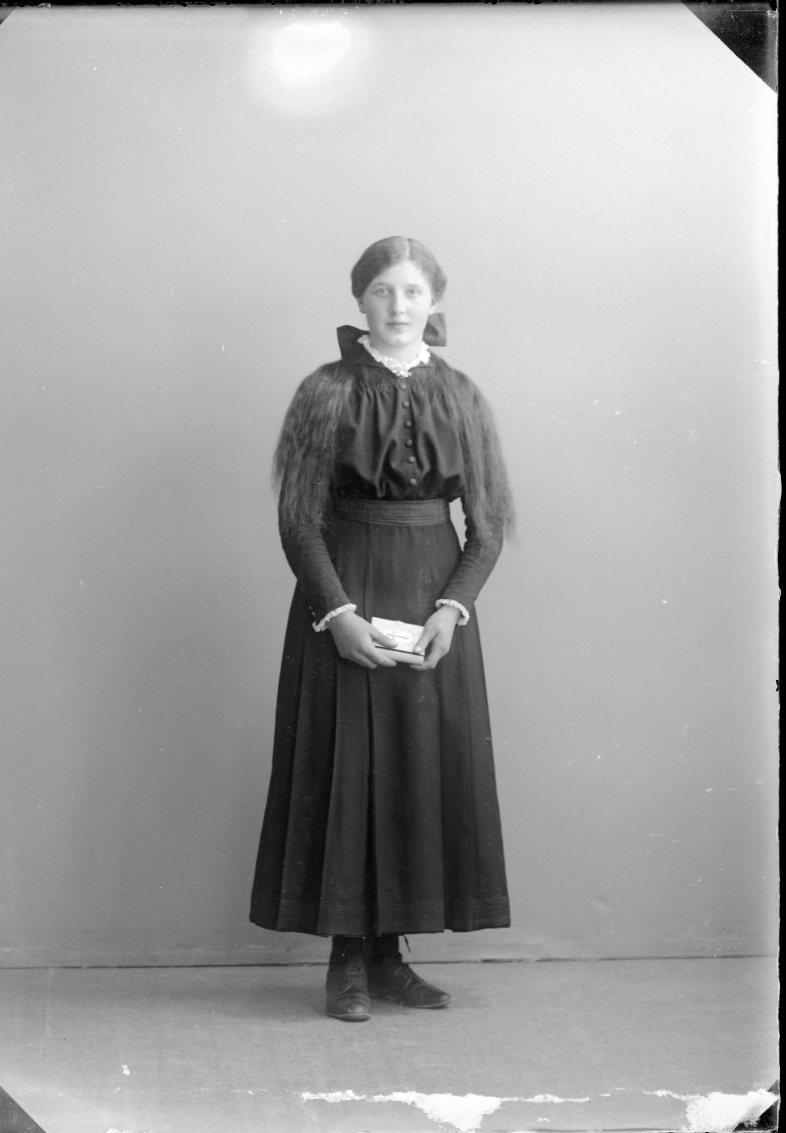 Porträtt av en långhårig flicka i mörk klänning. Hon håller något i händerna. Troligen konfirmationsbild