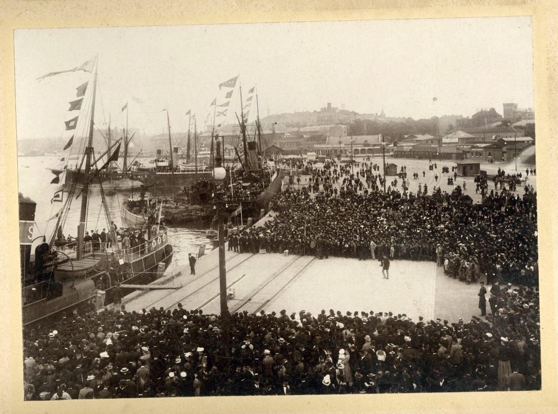 Virgo vid kaj i Göteborg klar för avgång. En stor folksamling står och tittar på. På akterdäck syns bland andra S A Andrée och Henri Lachambre initill varandra.