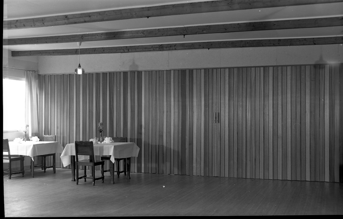 Titel: Dukade bord i en stor matsal, en stor vikbar dörr delar av rummet.