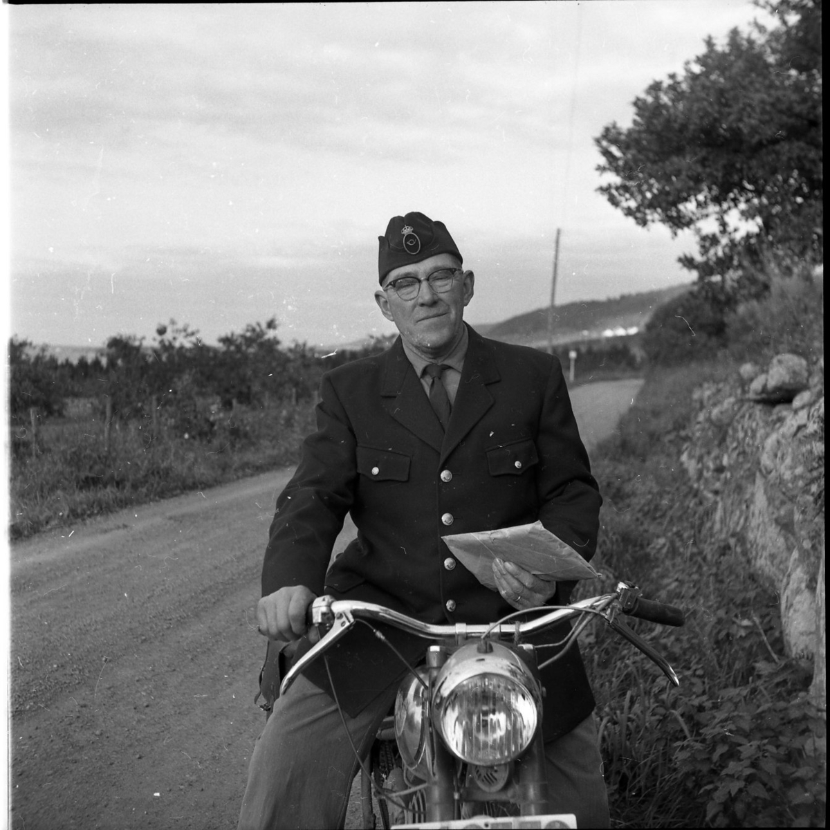 En man sitter på en moped och håller ett paket i handen. Han bär en postmössa med postens emblem längst fram.