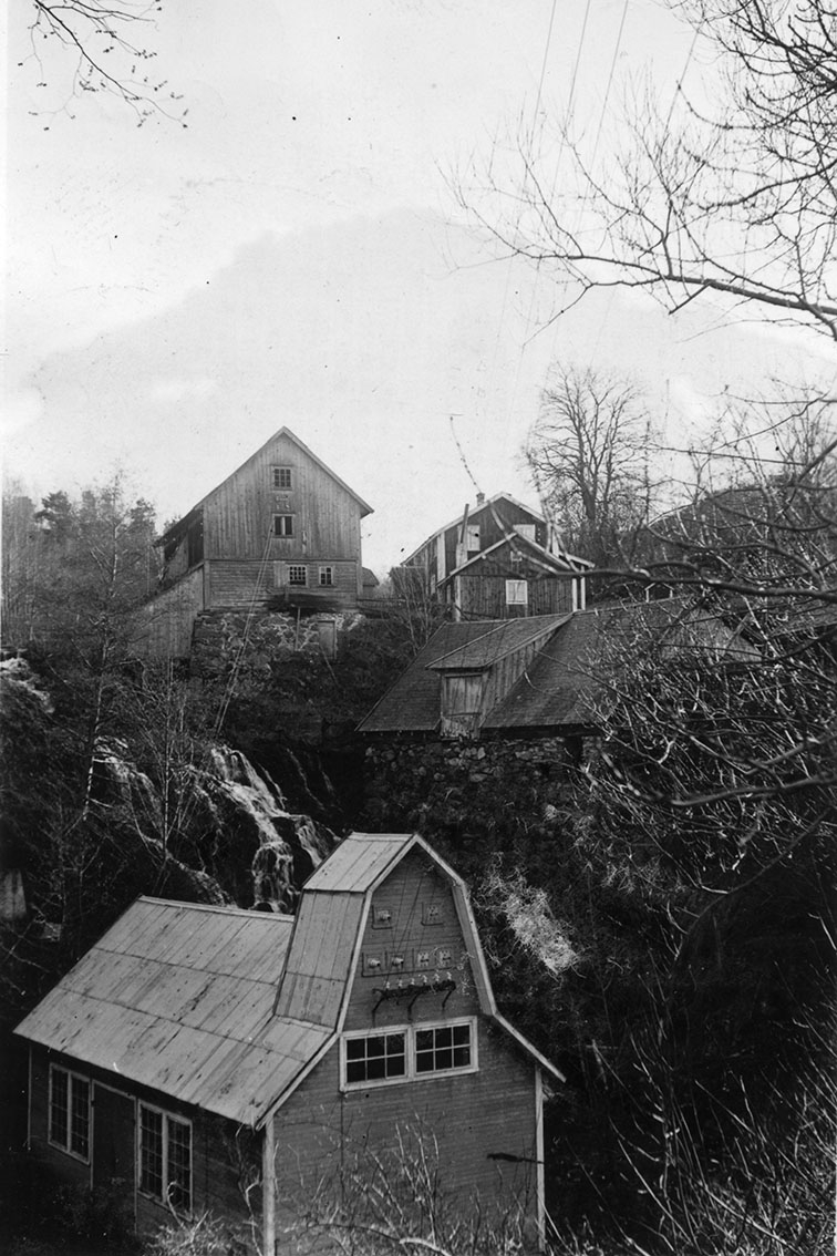 Motiv från Röttle by med provisorisk kraftstation till vänster och Jerusalems kvarn till höger. På höjden syns Wickboms kvarn till vänster en bostad till höger som likt Jerusalems kvarn finns kvar idag.