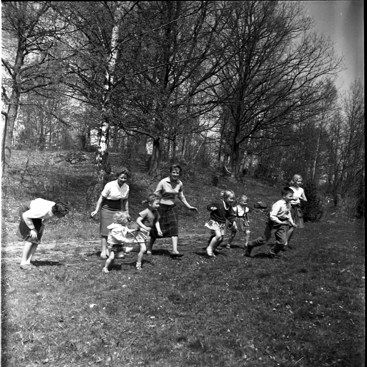 Barn och vuxna leker tillsammans. De springer över en gränsmatta. I bakgrunden syns björkar och granar.
