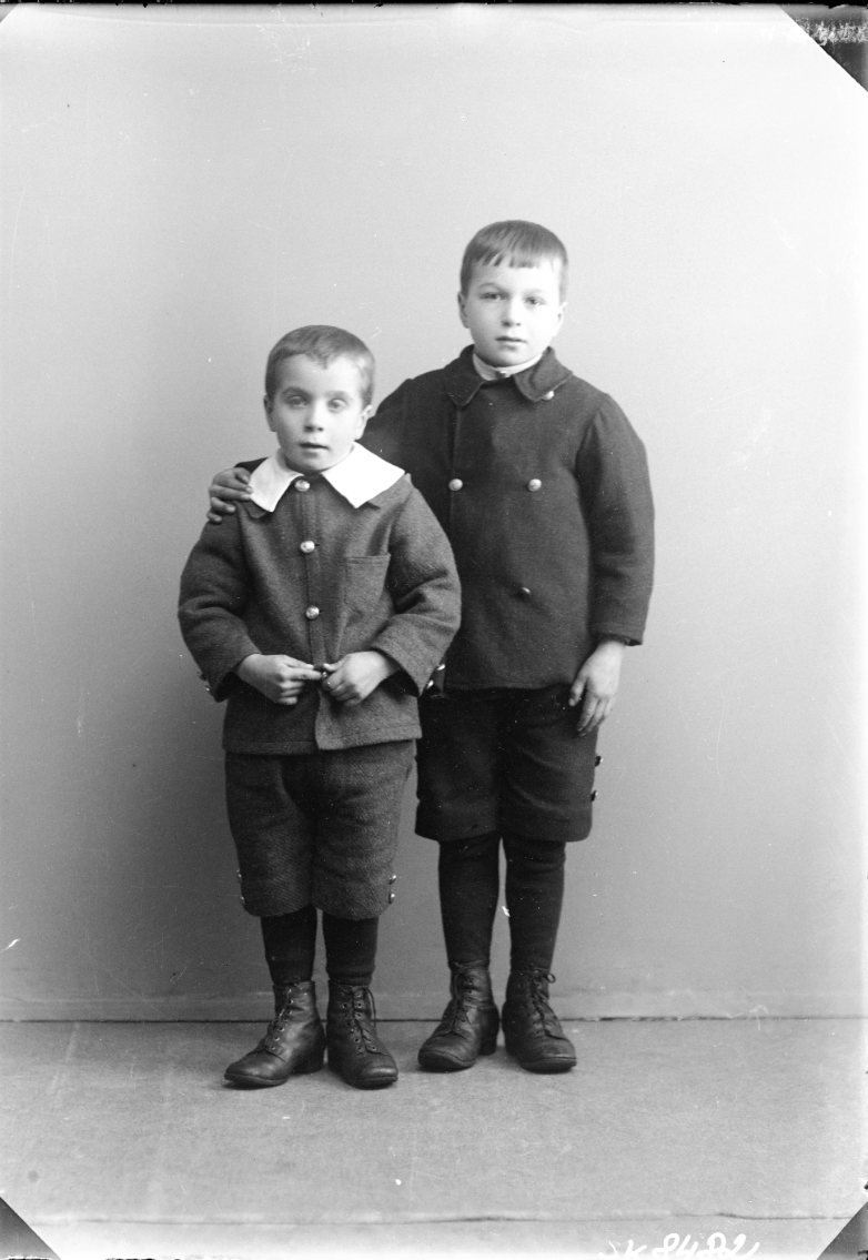 Porträtt av två små pojkar. Den något äldre håller om sin lillebror.