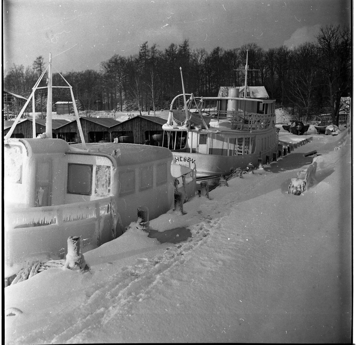 Två båtar står i en hamn. De är täckta med snö och det hänger istappar från relingarna.