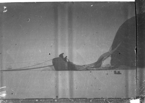 Oretuscherad. Ballongen Örnen har landat, 14 juli 1897. Troligen S A Andrée och Knut Fraenkel i ballongkorgen.