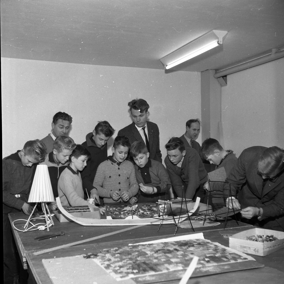 Sju pojkar står lutade över små mossaikplattor. Bakom dem står fyra vuxna män och tittar på.