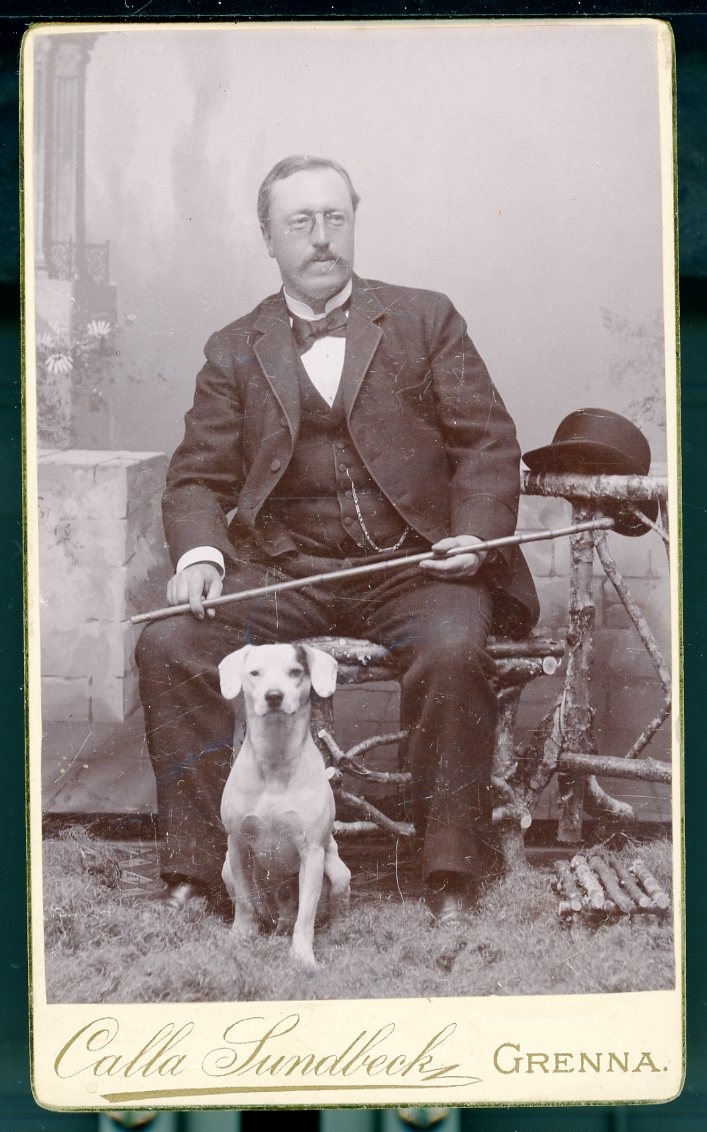 Kabinettsfotografi: Victor Hjertström sittande på en naturstol med spatserkäpp över knäna och hatten intill. En hund sitter framför honom.