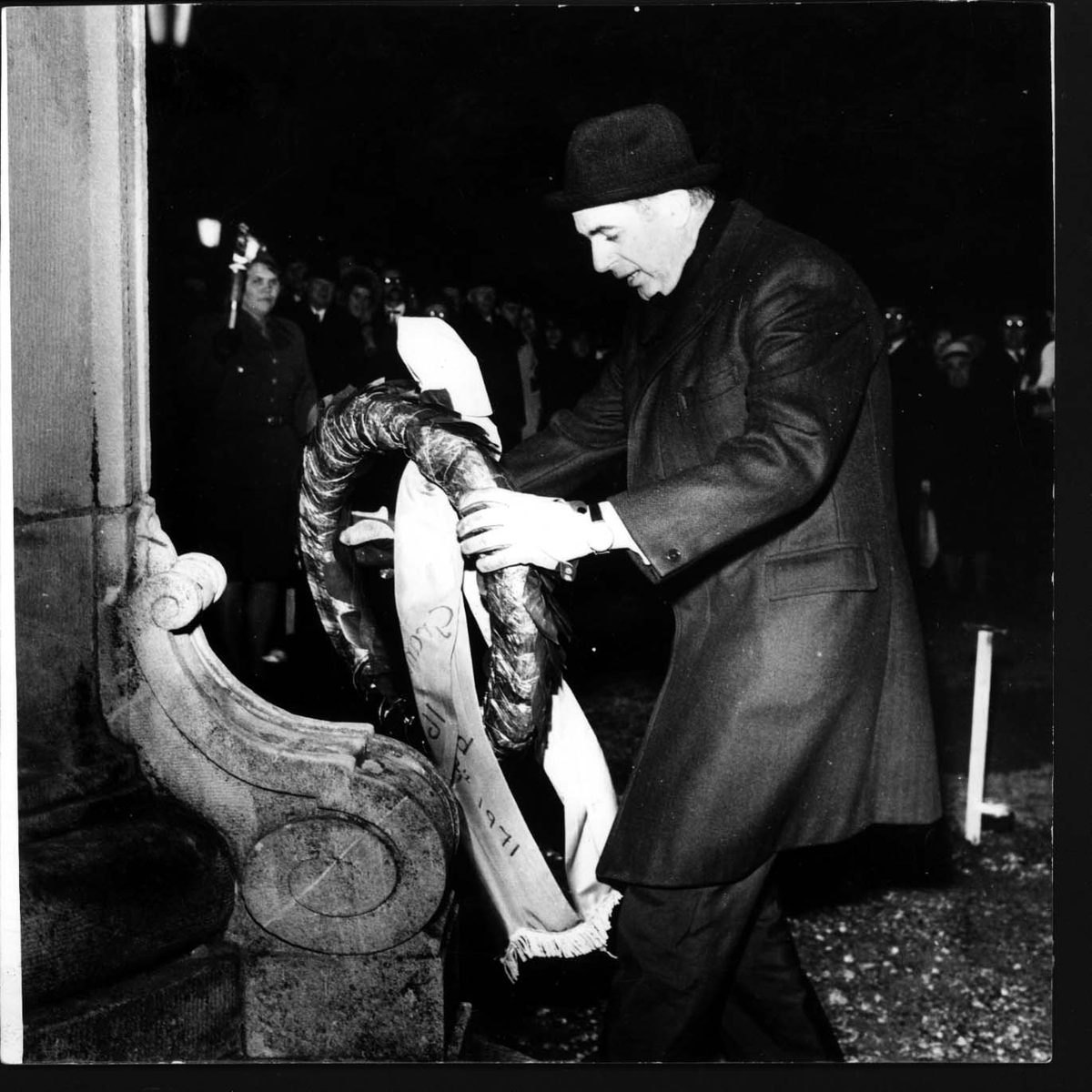 En man i rock och med hatt på huvudet lägger en krans vid en skulptur av greve Per Brahe den yngre på Gränna torg.