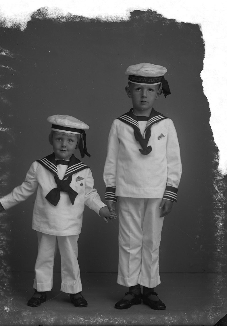 Barnen Lars och Sten Roman i sjömansuniform. De håller varandra i handen.