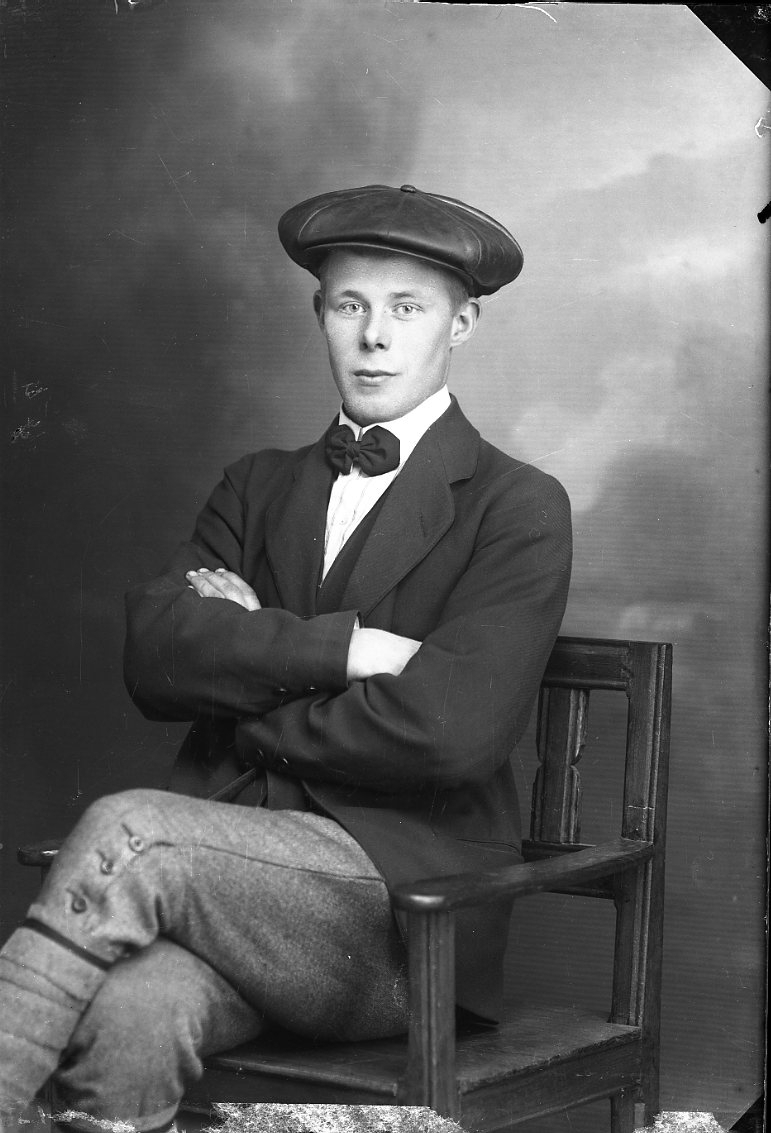 Porträtt av en yngling. Han sitter med armarna i kors och har en stor skinnkeps på huvudet.