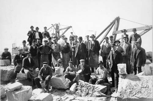 Ett 30-tal arbetare vid ett stenbrott, enstaka arbetad huggen sten - uggla. Vinschar syns i bakgrunden. En hund står på en huggen sten.