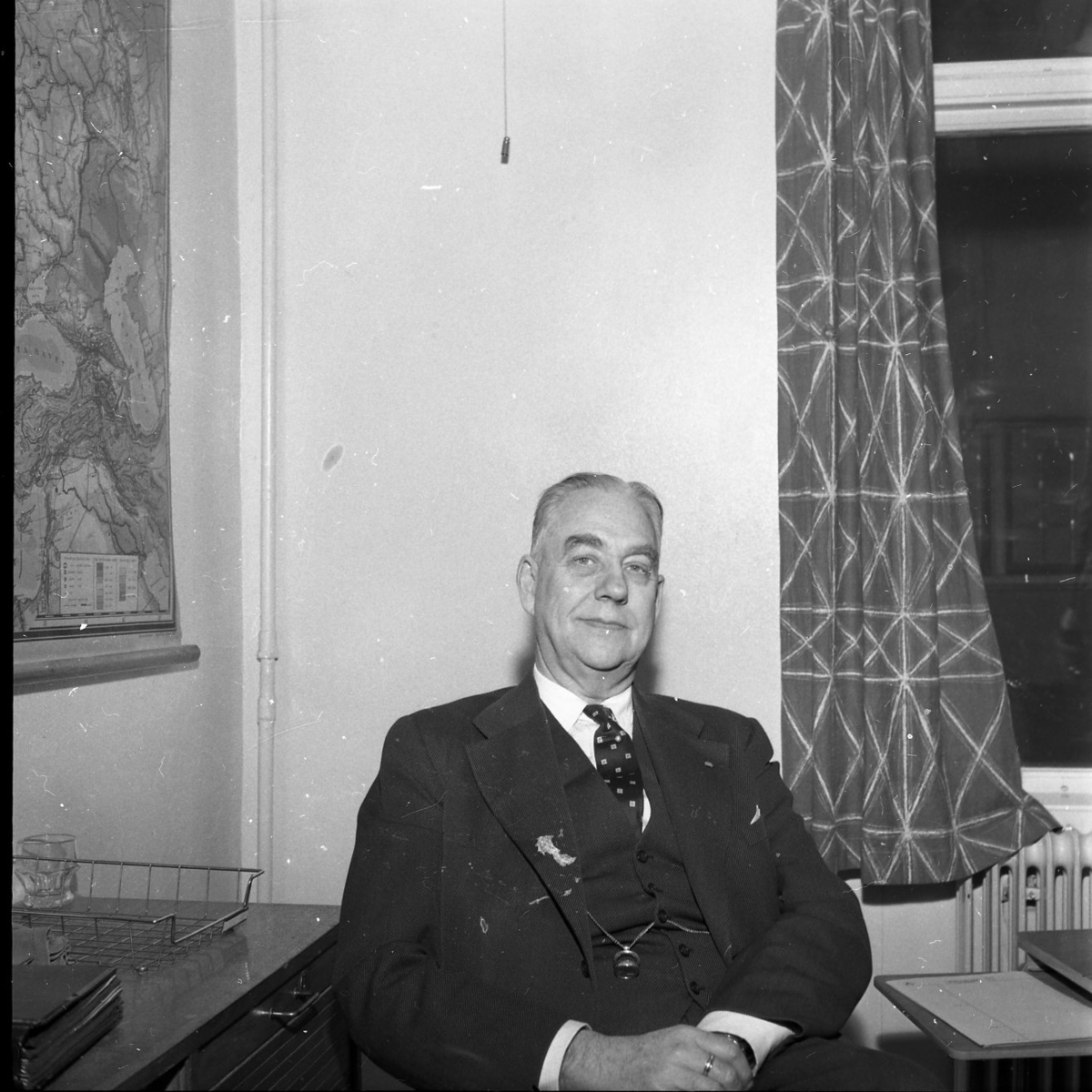 En sittande man klädd i konstym. Han tittar strax oavför kameran.