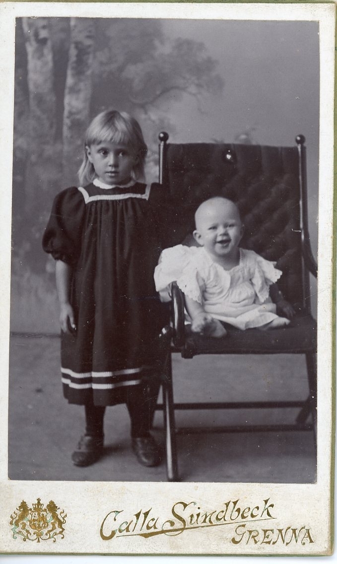 Kabinettsfotografi: ett skrattande spädbarn sitter i en stol. En flicka i mörk klänning med ljus bård står intill.