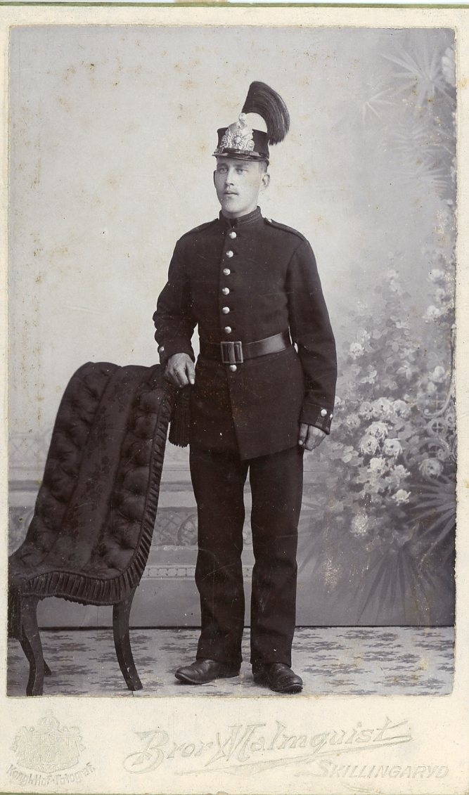 Kabinettsfotografi av en ung man i militär uniform. Han står med höger hand vilande på en stolsrygg.