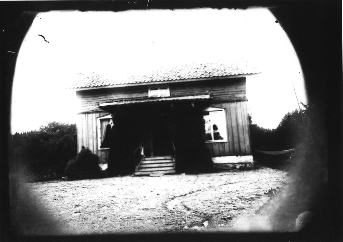 Okänd mindre knuttimrad stuga med vind med halvfönster. Panel med locklist upp till vindsvåning. Trapp upp till entrén.