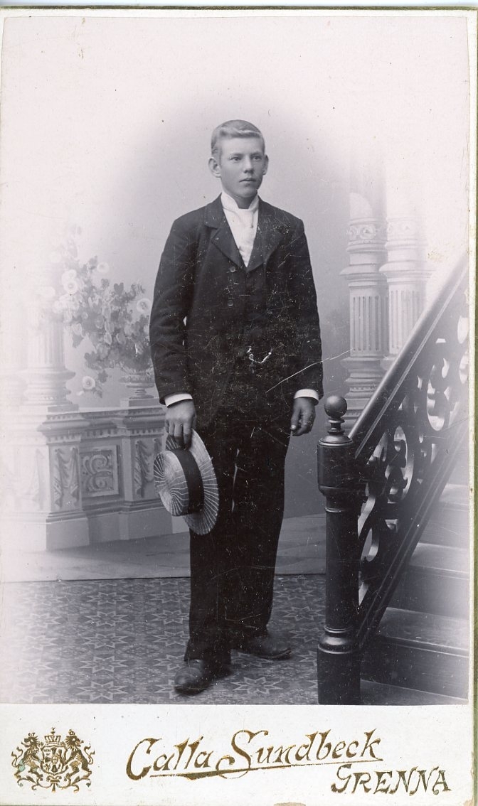 Kabinettsfotografi: en okänd ung pojke i tonåren med en stråhatt i vänster hand.