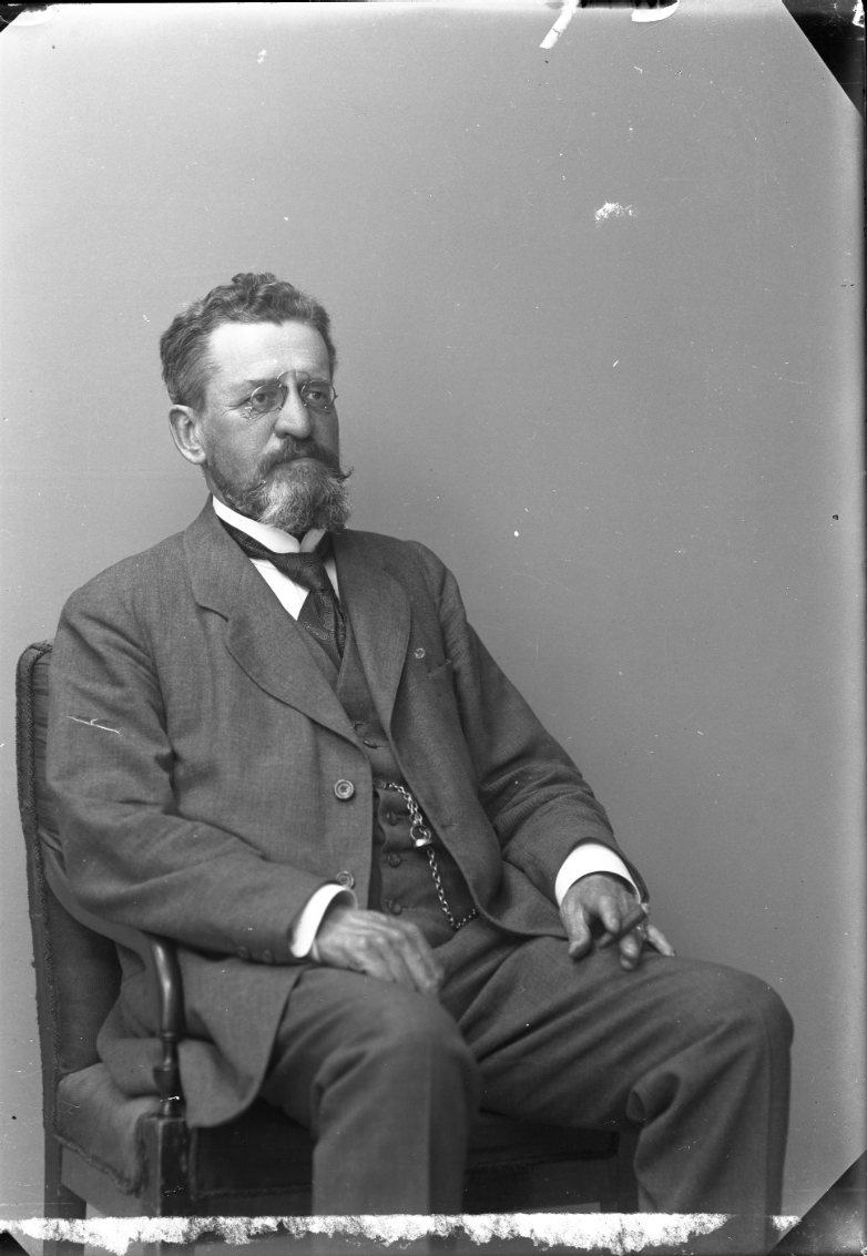 En man med glasögon och skägg sitter i en stol.