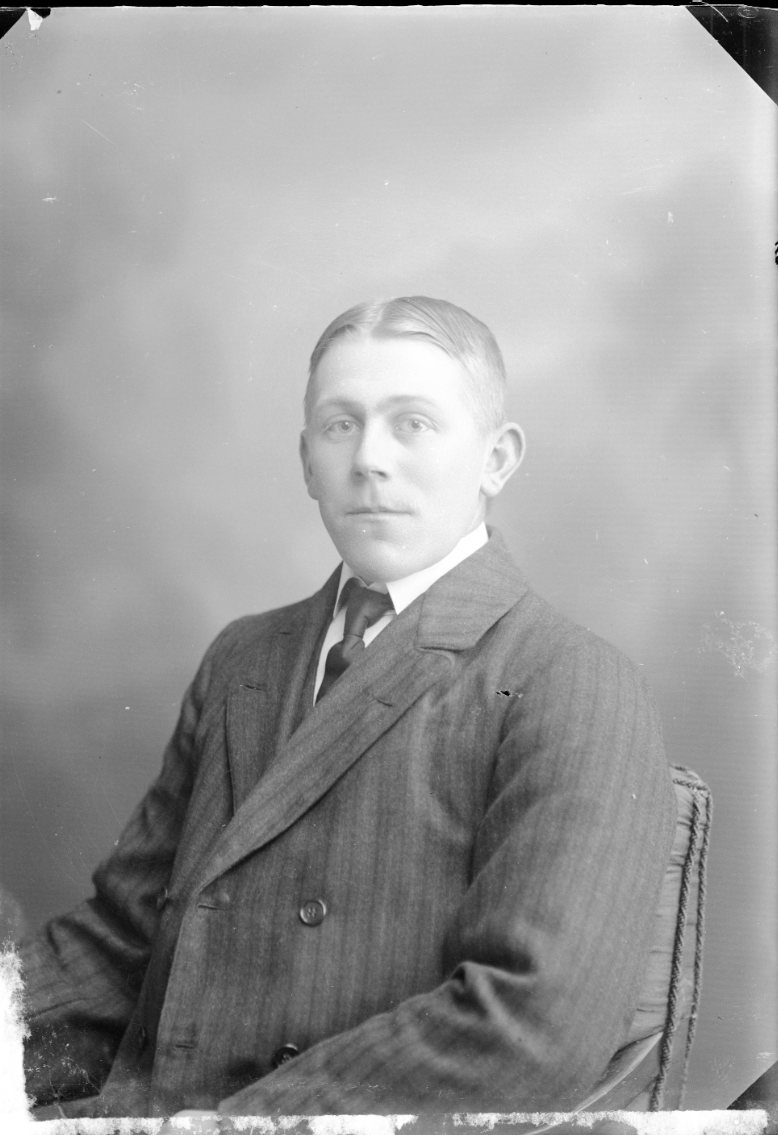 Porträtt av en ung man med slips som sitter i en fåtölj.
