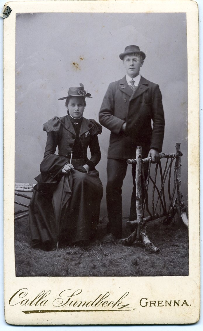 Kabinettsfotografi: gruppbild med en sittande ung kvinna intill en stående ung man. De bär ytterplagg och hatt. Hon håller ett paraply i handen och han håller höger hand innan kavajen, likt Napoleon.