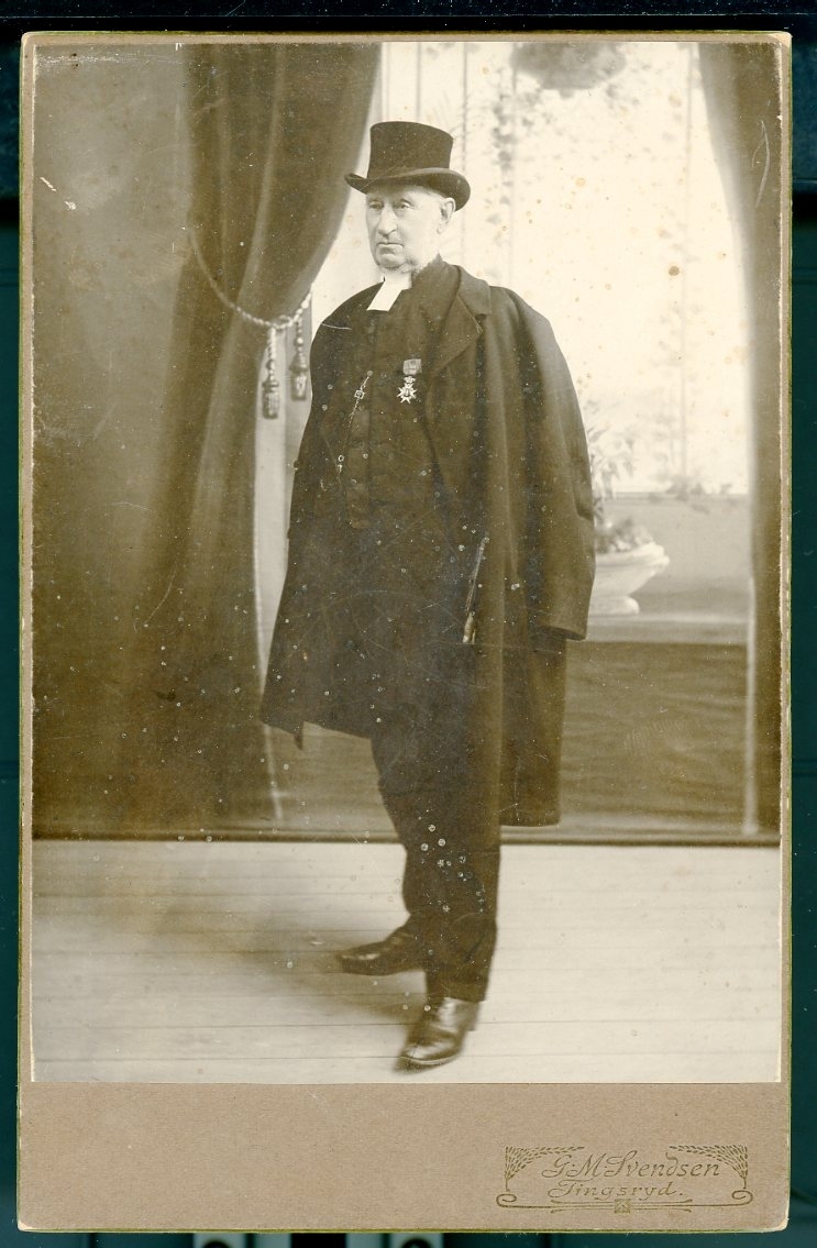 Kabinettsfotografi: Prosten Carl Gustaf Mozart i helfigur med medalj på bröstet, hög hatt och rocken över axlarna.