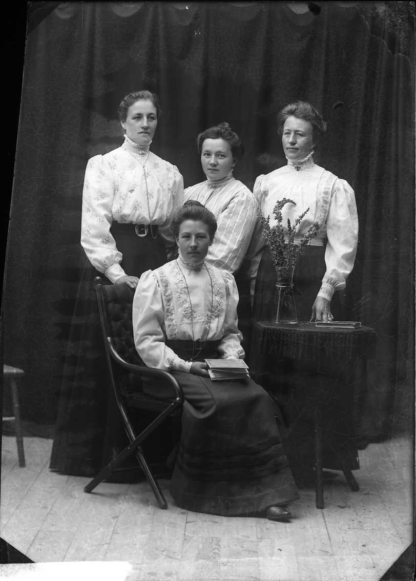 Gruppbild med fyra kvinnor, varav en sittande vid ett bord.