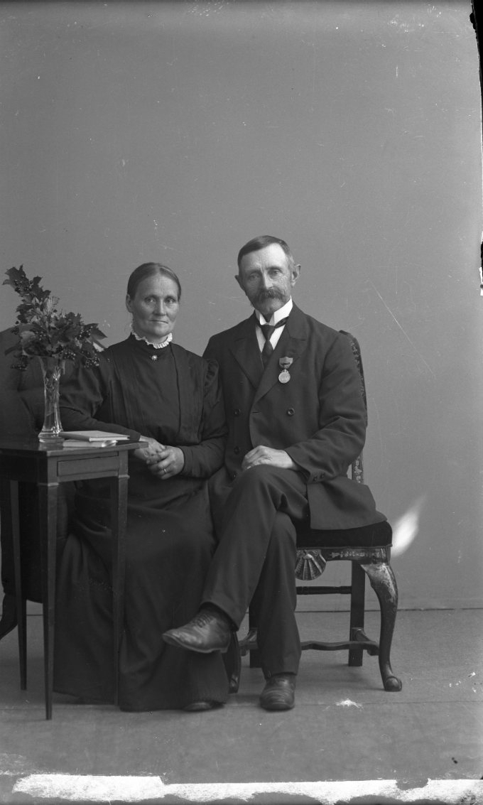 En äldre kvinna och man sitter på stolar intill varandra vid ett bord. Det ligger några tunna böcker på bordet och en vas med blommor. Mannen har en medalj på kavajslaget. Mannen är C J Karsson i Aranäs, kvinna är troligen hans hustru.