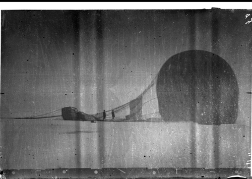 Oretuscherad. Ballongen Örnen har landat, 14 juli 1897 Troligen Nils Strindberg till vänster och S A Andrée till höger.