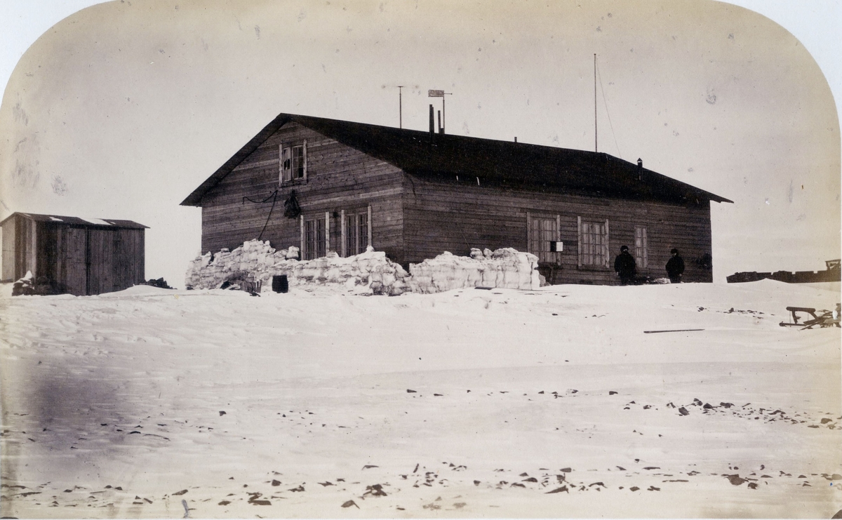 "Polhem', fr. sydvest, vinterdrägt, d.3 April 1873." Oidentifierade män mot husväggen.
