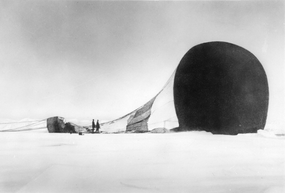Örnen har landat, 14 juli 1897. Troligen N Strindberg till vänster och S A Andrée till höger. Retuscherad version av gm.II-25