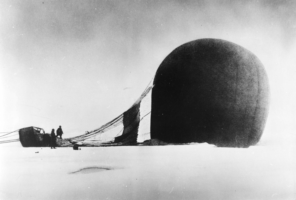Ballongen Örnen har landat. Knut Fraenkel till vänster och S A Andrée till höger. Retuscherad version av gm.II-22.