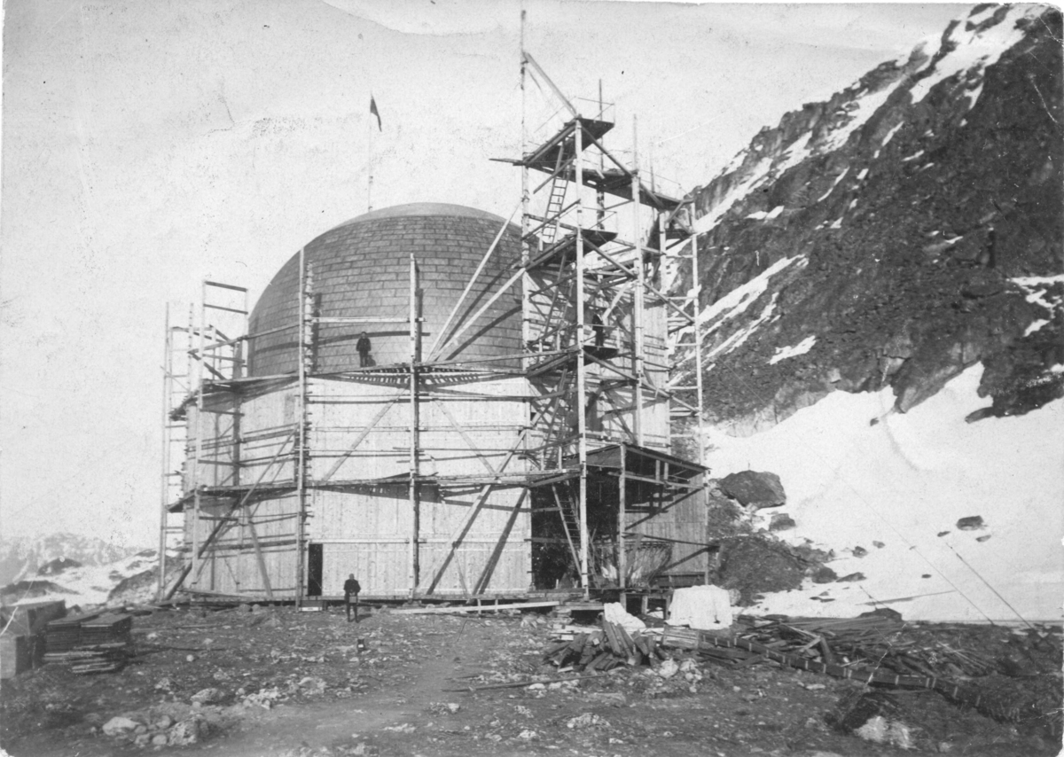 Ballongen Örnen fylld. Sannolikt Strindberg med kamera framför ballonghuset.